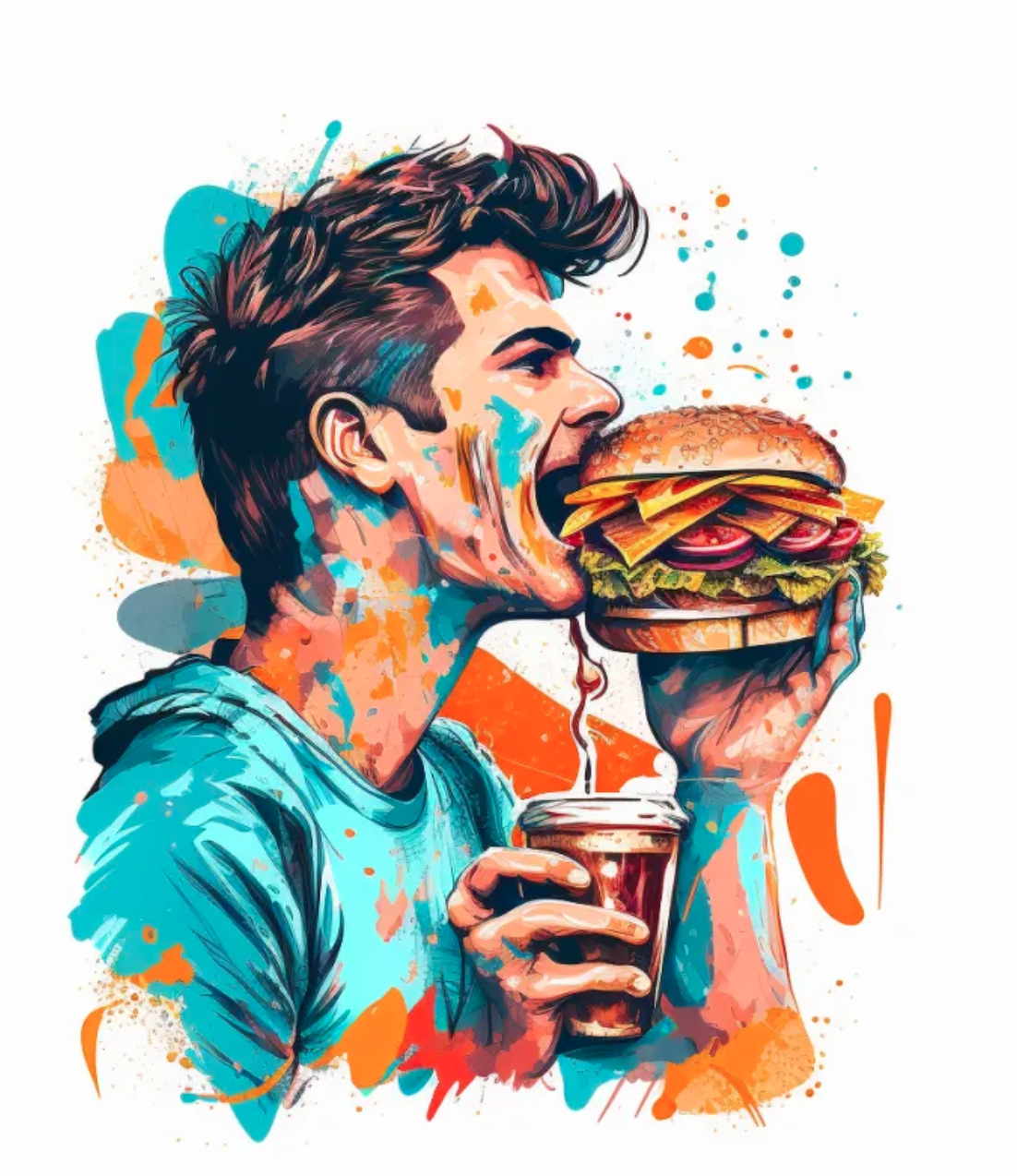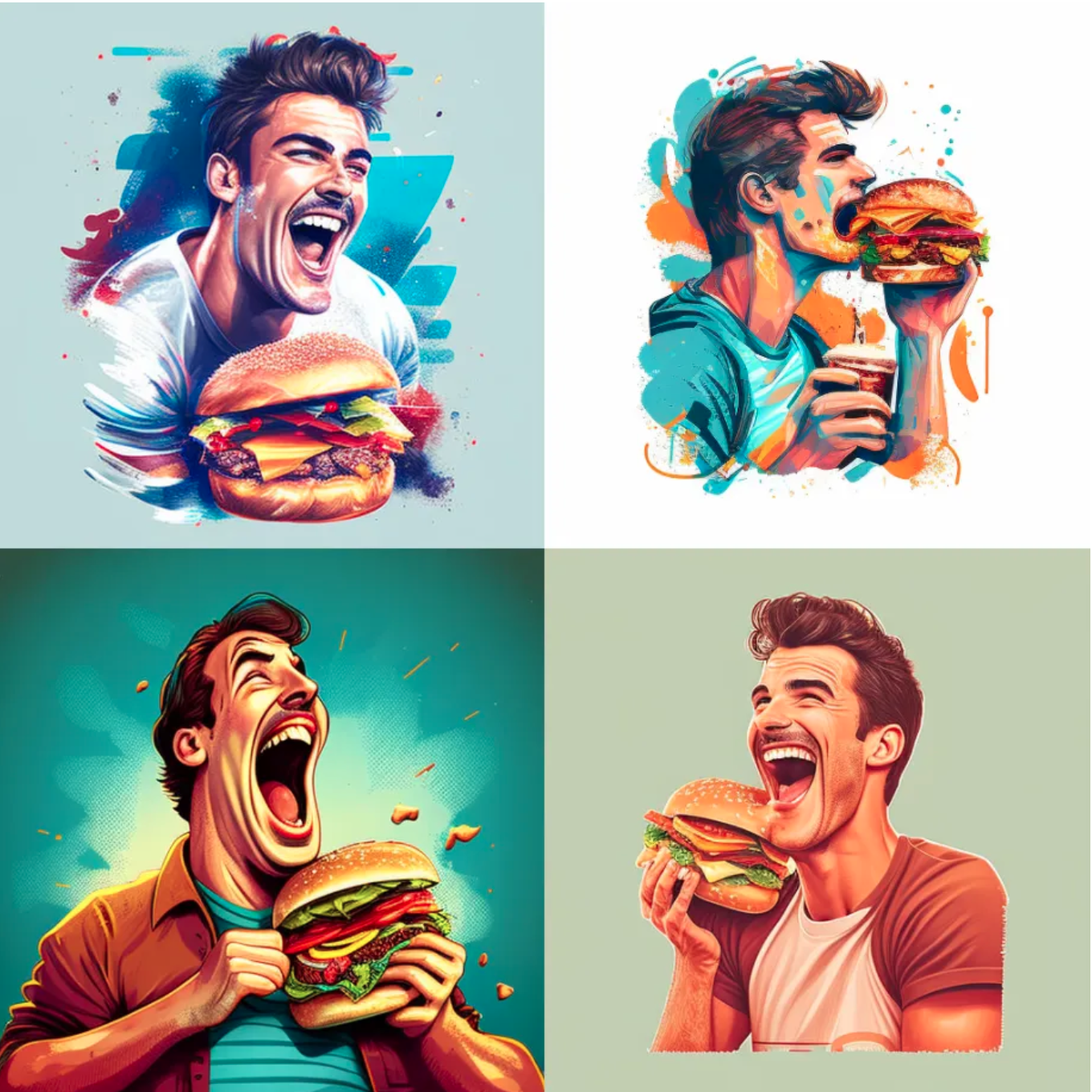 /imagine happy man eating a burger, high resolution, high quality illustration